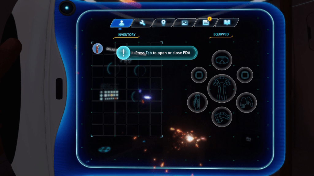 Subnautica has fairly minimal amount of keys to press and a small control scheme. You move around with the usual movement buttons, and pick up or use items with your left or right mouse button. Most things in the game is handled by your PDA. In the PDA you firs see your inventory screen, where you can see your equipment as well as the items you are currently carrying. Do note that some items and materials takes up more slots, so it’s not always a 1/1 slot for every item!
