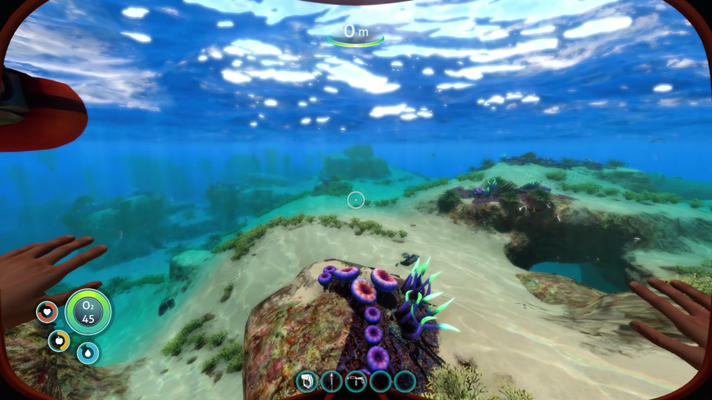 Leaving the lifepod, your first sight will be either the water or the wreckage of the Aurora. Unlike alot of survival games, Subnautica’s gameworld is fixed in terms of location, with only a few minor details & coordinates of your lifepod being randomly generated. There is no map in Subnautica, so the Aurora wreckage serves as an excellent navigation point for your explorations.