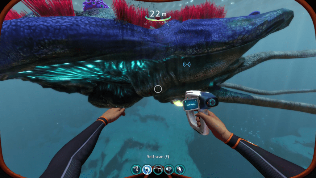 Health is also simple. You have a regular HP bar like most games and if you get hurt, you lose HP. If it hits 0 you die. There are no weapons in Subnautica, aside from a small knife which can scare away weaker predators. So in order to survive, you need to learn how to understand the wildlife, which is where scanning comes in!