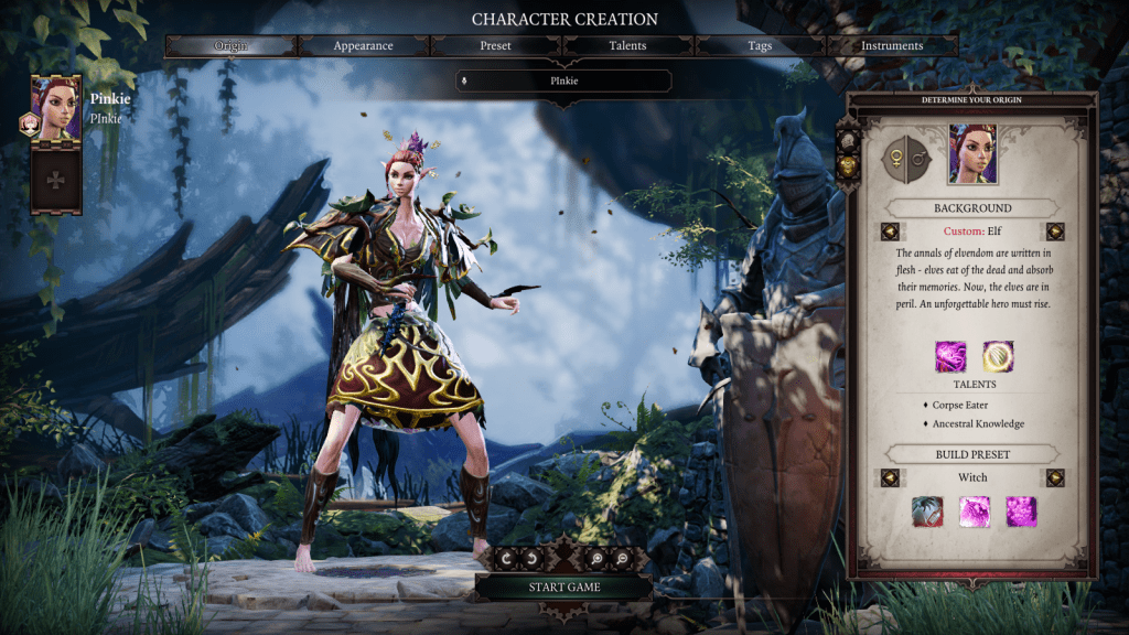 For this playthrough I created a custom character. A flesh devouring elf that can read memories of the dead by feasting on their body parts. She could also speak to animals. Her occupation was a witch.. which actually meant she was a necromancer..who can summon mosquitoes for some reason! Maybe it’s an UNDEAD mosquito… She was also very good with a bow.. because life drain and ranged .. is such a neat little combo! Being part Hunter made her able to leap around the battlefield and haste herself. ..How do you call an insane Elf who talks to the dead and Animals? Pinkie of course! She teamed up with three named characters for my adventure and did it on the Story playthrough difficulty. I did not get to choose so I assume it’s either normal or easy! Pinkie’s journey began when she woke up on a ship with a green glowing disk around her neck. What the heck! So unfashionable!