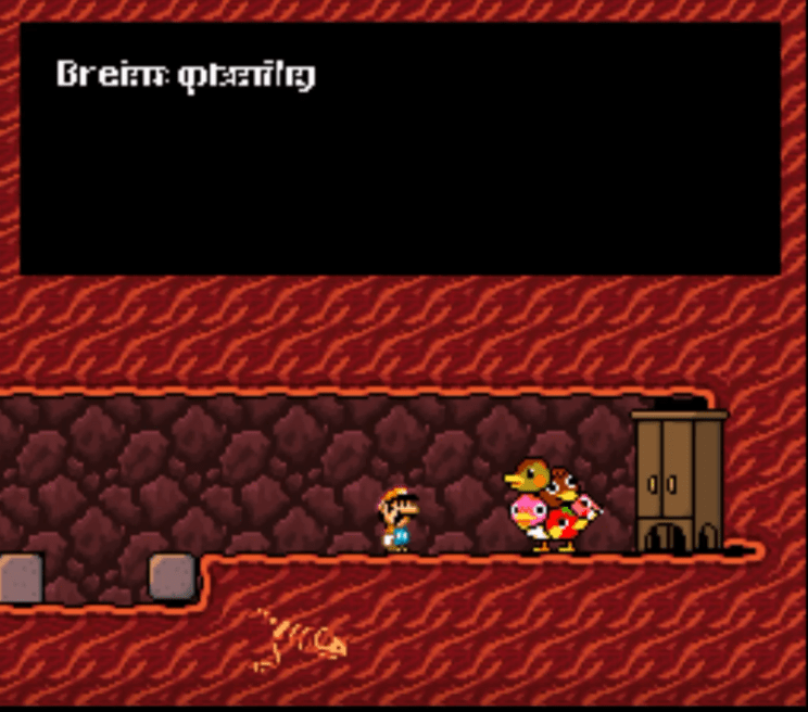 Crying is Sponge’s variant of the fire flower, but instead of throwing fire from his hands he throws water from his eyes if he hits something that can be hurt by his tears it turns into coins… like Piranha flowers! I move on and get faced with an onslaught of ducks and I mean an onslaught! So much that there has been a variant of this rom where the number of enemies was turned down to a more reasonable amount…but I played the regular difficulty version, although later admittedly with save states to save me from some checkpoint tedium. It is a stage that is somewhere of a 6th to 8th world difficulty in Super Mario Standards. It is tricky for sure but very doable! I find the letter B and take it with me.. it has to be here for some reason right? I die a few time and can not activate the letter B no matter how hard I try.. so I take it with me across the entire stage.. until I encounter a bird tomb! Which of course is missing a letter B! I place the letter and get access to a new location!