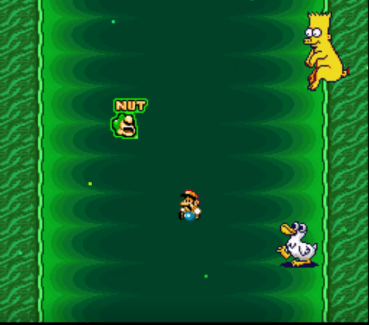 I am filled with confidence that I can handle whatever this game will throw at me.. and it begins with the drop in a pit! Bart Simpson pig shows up.. Peter Griffin with a mushroom cap hat.. a guy cosplayed like Simon Belmont.. and a Luigi shouting NUT! Then I fall even deeper and land back to the 2d stages… a Duck man tells me he hates me.. a duck tells me his dad is mean and so are his brothers. To the right a series of Piranha plants block my path.. so I have to go left where a Chozo statue gives me my first power up! Crying!