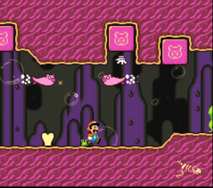 Mario’s Mystery Meat, is a Rom Hack for Super Mario World, which means it can be played on an emulator or put on a fan cartridge if you find the right guy! But it is a very special romhack, that features many different forms of Gameplay! We are introduced to Sponge in a very classical Super Mario World level.. but very much in hte style of how a stage randomiser rom hack works. Elongated sections of blocks and sped up enemies immediately will show you, this Rom Hack won’t be easy. Clearing the stage will send you to a twisted Dimension and the Playstation theme boots up.. the worm thing shows upand you jump in it’s mouth. The map we got promised from the beginning is gone.. there is just one stage.. called Meat!