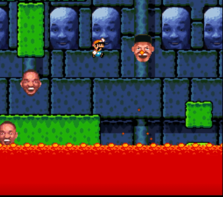 The first step of the castle however is quite fun! It feels like a great final stage for a Mario game. It is challenging by riding floating blocks.. doding will Smith shaped Twomps.. and Will Smith shaped Lava fish and features an enemy that eats the stage! It offers some interesting jump puzzles… the second part of the castle however… made me almost rage quit. In a vertical autoscroll, race to the top against lava, filled with one block wide precision jumps, fake out twomps and trial of error segments we get a stage that is so blood boiling it almost made me quit! Savestates made this manageable.. but this is on the level of those insanely difficult Mario Maker stages.